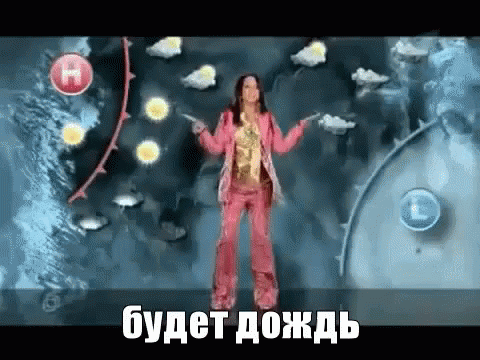 Singer Sofia Rotaru dances in a pink suit in front of a weather map, predicting 'it will rain'.