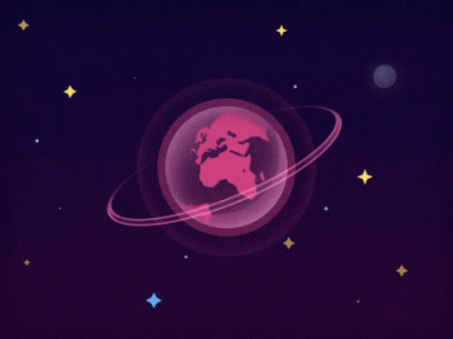 An animated purple planet with rings rotates in space, orbited by a yellow sun and surrounded by stars.