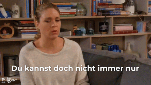Jelena Mitschke as Britta Berger in Rote Rosen, saying "You can't always just work!" while sitting on a couch.