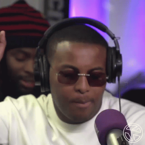 Jay More Life performing at Rotterdamairlines Gate19, wearing headphones and sunglasses, speaking into a microphone.