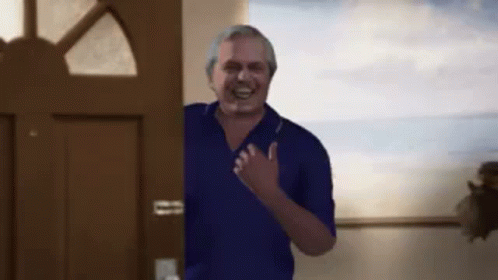 Alberto Fernandez laughs as he gets hit by a pillow after opening a door.