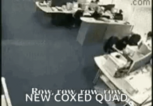 Office workers simulate rowing a boat using their chairs, forming a 'New Coxed Quad' in a humorous workplace scene.