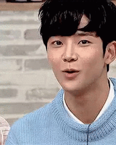 Rowoon smiles and makes a peace sign, wearing a light blue sweater and white shirt.