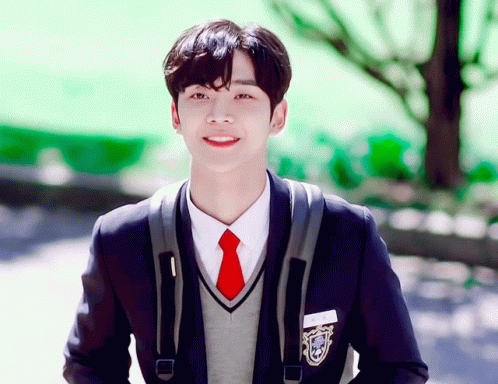 Rowoon from SF9, also known as Kim Seokwoo, smiling brightly in a school uniform with a red tie and backpack.