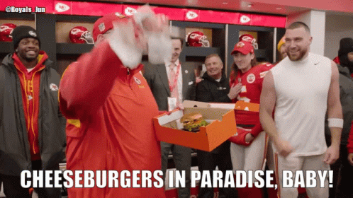 Andy Reid and Travis Kelce celebrate with the Kansas City Chiefs, enjoying 'Cheeseburgers in Paradise' in the locker room.