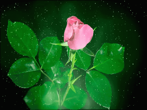 A beautiful pink rose slowly blooms amidst green leaves, enhanced by sparkling effects against a dark background.