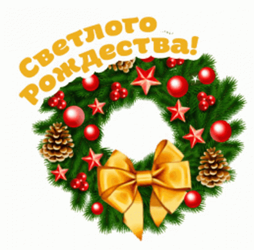 A festive Christmas wreath adorned with a golden bow, pinecones, and berries, wishing 'Merry Christmas!'