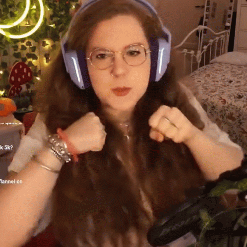 Rozenessa makes a playful punching gesture towards the camera while streaming, engaging with her chat.