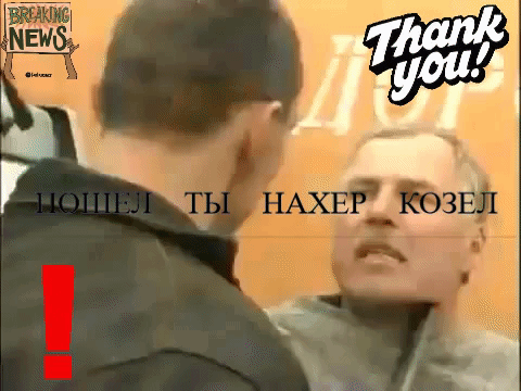 An angry man confronts another, with the Russian phrase 'Go to hell, you goat!' and 'Thank you!' on screen.