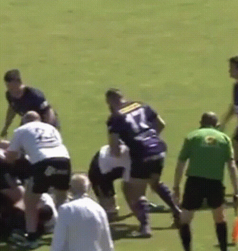 Rugby players from Issoire engaged in a scrum or ruck during a match, with a referee overseeing the play.
