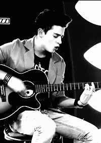 Ruggero Pasquarelli passionately sings and plays an acoustic guitar in black and white.