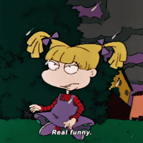 Angelica Pickles from Rugrats sarcastically says "Real funny" with a disgruntled expression.