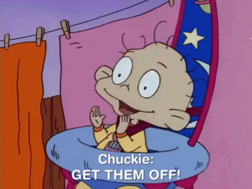Chuckie Finster from Rugrats excitedly shouts 'GET THEM OFF!' while in his high chair.