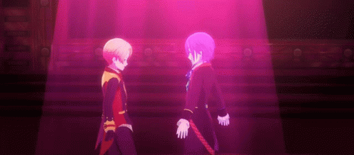 Tsukasa Tenma and Rui from Project Sekai stand close on a stage, bathed in pink light.