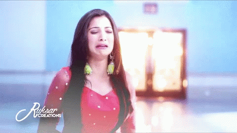 Vrushika Mehta crying emotionally, wearing a red dress and yellow bangles, in a scene from a show.