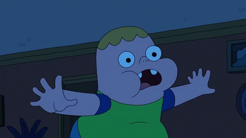 Clarence, the cartoon character, runs away in a scared sprint, eyes wide with fear.