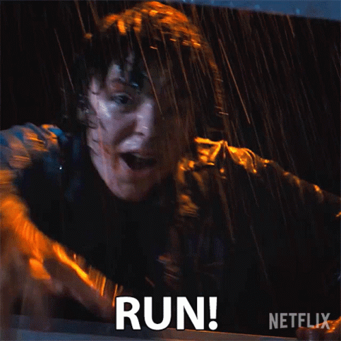 A man in distress, soaked by rain, reaches out as the word 'RUN!' flashes, from a thrilling Netflix scene.