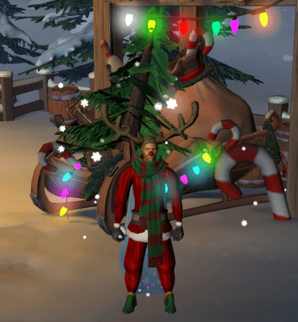 Runescape character in a reindeer hat and Santa outfit performs a festive Christmas emote in a snowy scene.