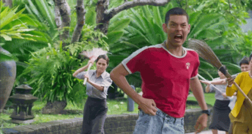 Apiwit Bartholomew screams and runs, chased by people wielding brooms in a chaotic scene from a Thai drama.