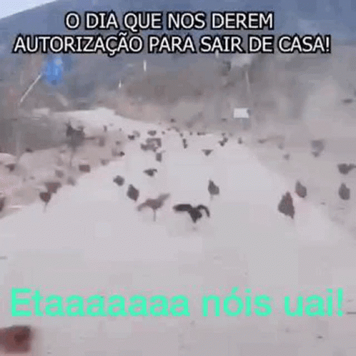 Many chickens running rapidly down a snowy path, humorously compared to people rushing out after getting authorization to leave home.