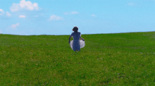 Renforshort, a woman in a white dress, runs freely through a vibrant green grassy field under a blue sky.