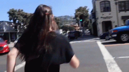 A person with long hair, wearing a black shirt, runs down an urban street, moving quickly past cars and buildings.