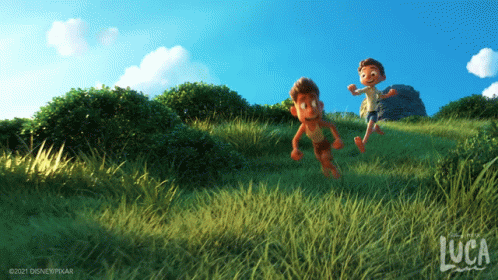 Luca Paguro and Alberto Scorfano playfully running and racing through a vibrant grassy field.