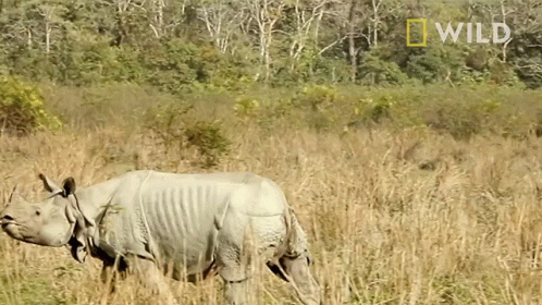 An Indian rhinoceros walks through tall grass in Kaziranga National Park, featured by Nat Geo WILD.