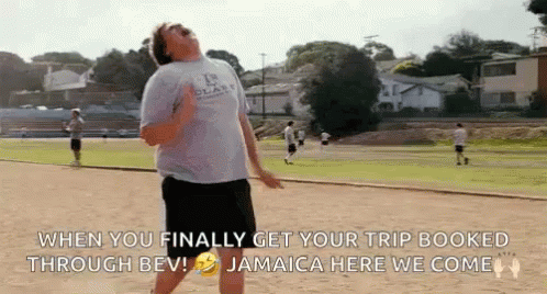 A man celebrates joyfully on a running track after finally booking his trip to Jamaica through Bev.