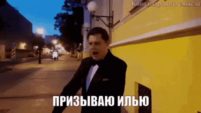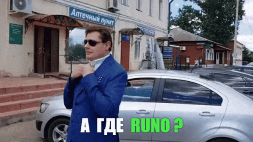 Ruslan, a man in a blue suit, asks 'Where is RUNO?' in front of a pharmacy.