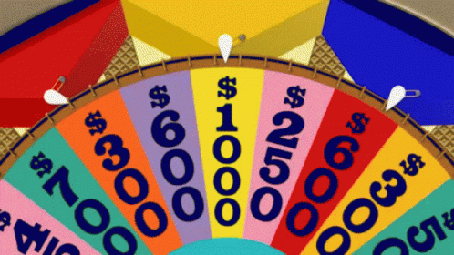 A vibrant Wheel of Fortune spins, featuring various dollar amounts, 'BANKRUPT', and 'LOSE A TURN' segments.