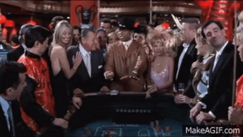 Chris Tucker in a lively casino scene from Rush Hour 2, surrounded by a crowd at a gambling table.