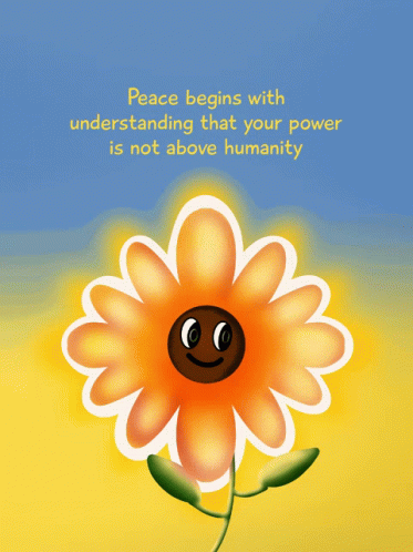 A cartoon sunflower with a smiling face against a blue and yellow background, conveying a powerful message about peace and humanity.
