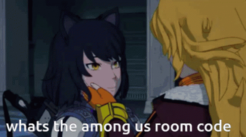 Blake Belladonna and Yang Xiao Long from RWBY look at each other with the text 'whats the among us room code'.