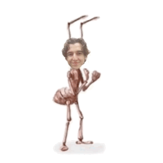 A unique drawing featuring Ryan McMahon's likeness blended with an ant, carrying a small bag on a stick.