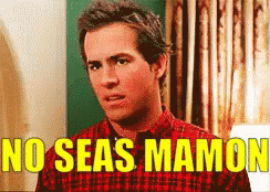 Ryan Reynolds looks annoyed, with the text 'No Seas Mamon' overlaid in yellow letters.