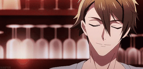 Ryunosuke Tsunashi from Idolish7 turns and gives a charming smile, set against a backdrop of wine glasses.