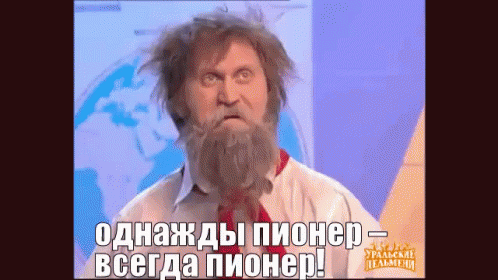 Man from Uralskie Pelmeni, dressed as a pioneer, says 'Once a Pioneer – Always a Pioneer!' for Pioneer Day.