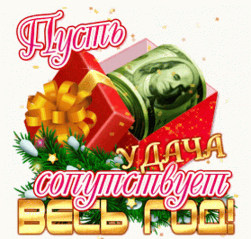 Animated New Year greeting with a gift box full of dollar bills and a wish for luck.