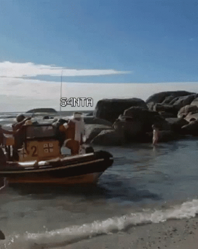 S4nta Estalia features Santa Claus comically falling out of a boat onto a sandy beach, then recovering.