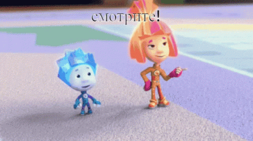 Fiksiki cartoon characters Simka and Nolik stand together with the Russian caption 'СМОТРИТЕ!' (Look!).