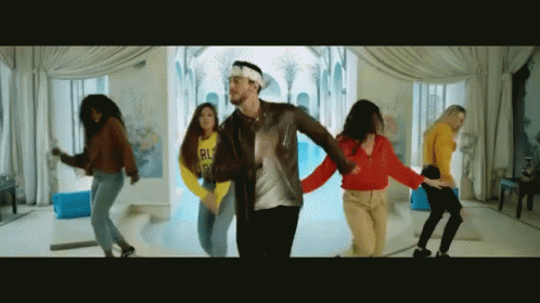 Moroccan singer Saad Lamjarred dancing energetically with a group of people in an ornate room.