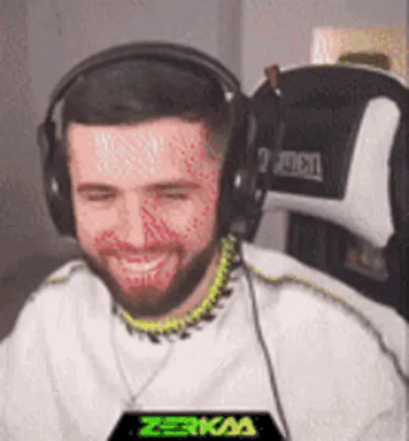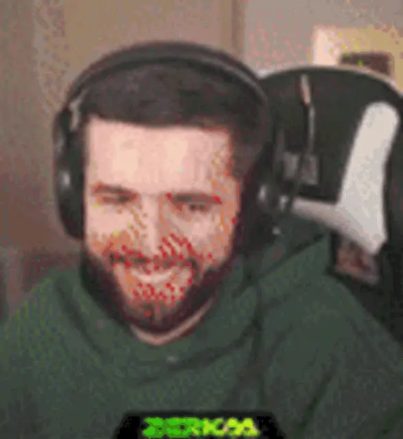 Saashly Tommy Tate in a black suit and green tie, holding a rifle and giving a thumbs-up on a green screen.