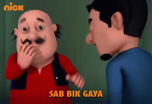 Animated character Motu exclaims 'Sab Bik Gaya' (Everything is sold) to another character from Nickelodeon India.