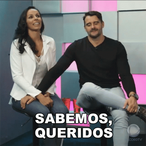 A couple from Power Couple Brasil, possibly Paula Pequeno, sits with the caption 'Sabemos, Queridos' (We Know, Dears).