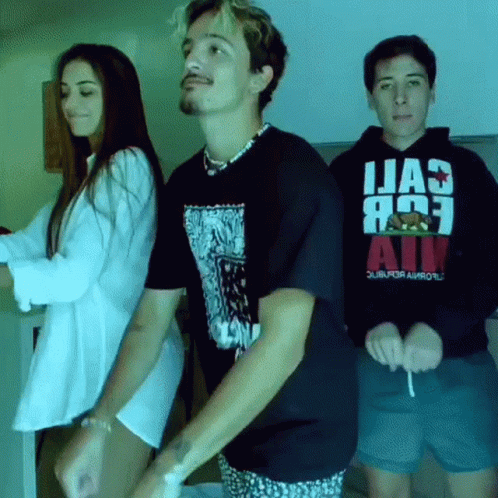 Sabina Hidalgo, Gogo Marquez, and Juan Pabllo dancing together in a fun, color-changing room.