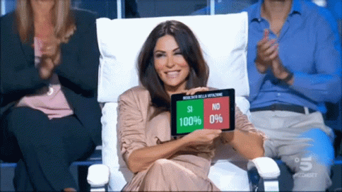 Sabrina Ferilli proudly displays a tablet showing a 100% "Sì" vote result on Tu Si Que Vales.