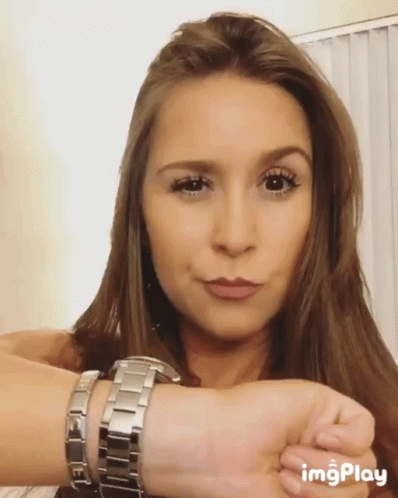 Sabrineferretti looks at her watch with a serious expression, seemingly running late.