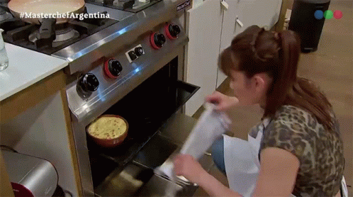 Tigresa Acuña carefully removes a dish from the oven during Masterchef Argentina, showcasing her cooking skills.