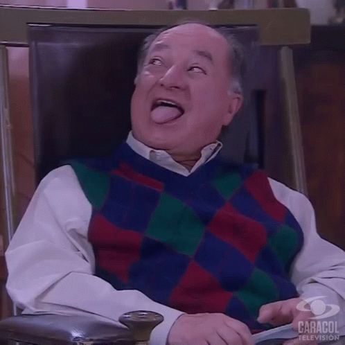 Alberto Saavedra as Gervasio playfully sticks out his tongue and laughs while sitting in a chair.